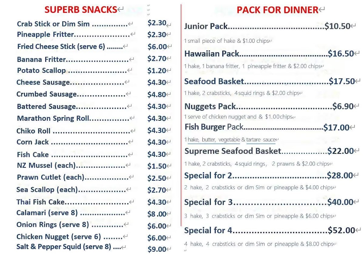 What sets Seabreeze apart is their attention to detail—staff thoughtfully ask how you prefer your chips cooked, promising a personalized experience whether you like them soft, medium, or crunchy. The menu also features convenient packs for different appetites, from the Junior Pack to the generous Special For 4, ideal for sharing.