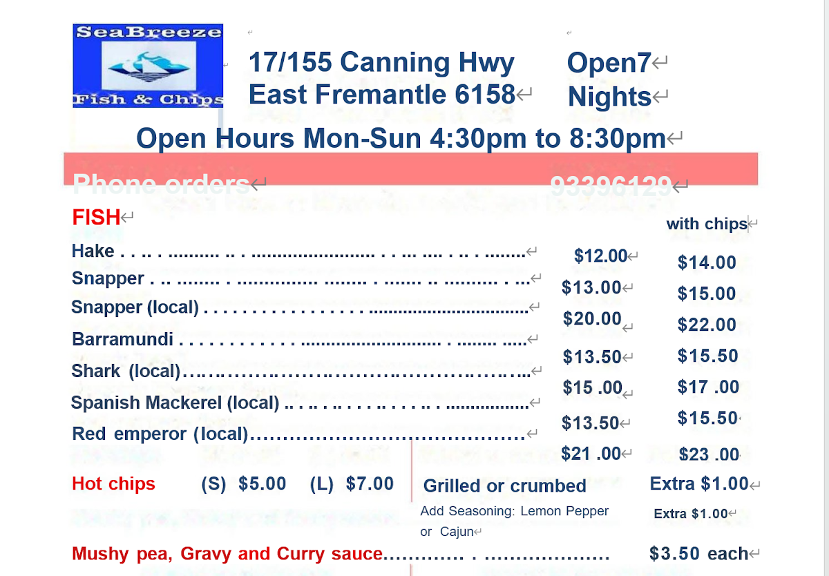 Seabreeze Fish and Chips in East Fremantle offers a fresh, vibrant take on classic seafood favorites. Their menu highlights a variety of premium fish options including hake, snapper, barramundi, shark, Spanish mackerel, and red emperor, all cooked to perfection. Each dish comes paired with golden hot chips, crisp salads, and sides like mushy peas, gravy, and curry sauce, catering to diverse tastes.